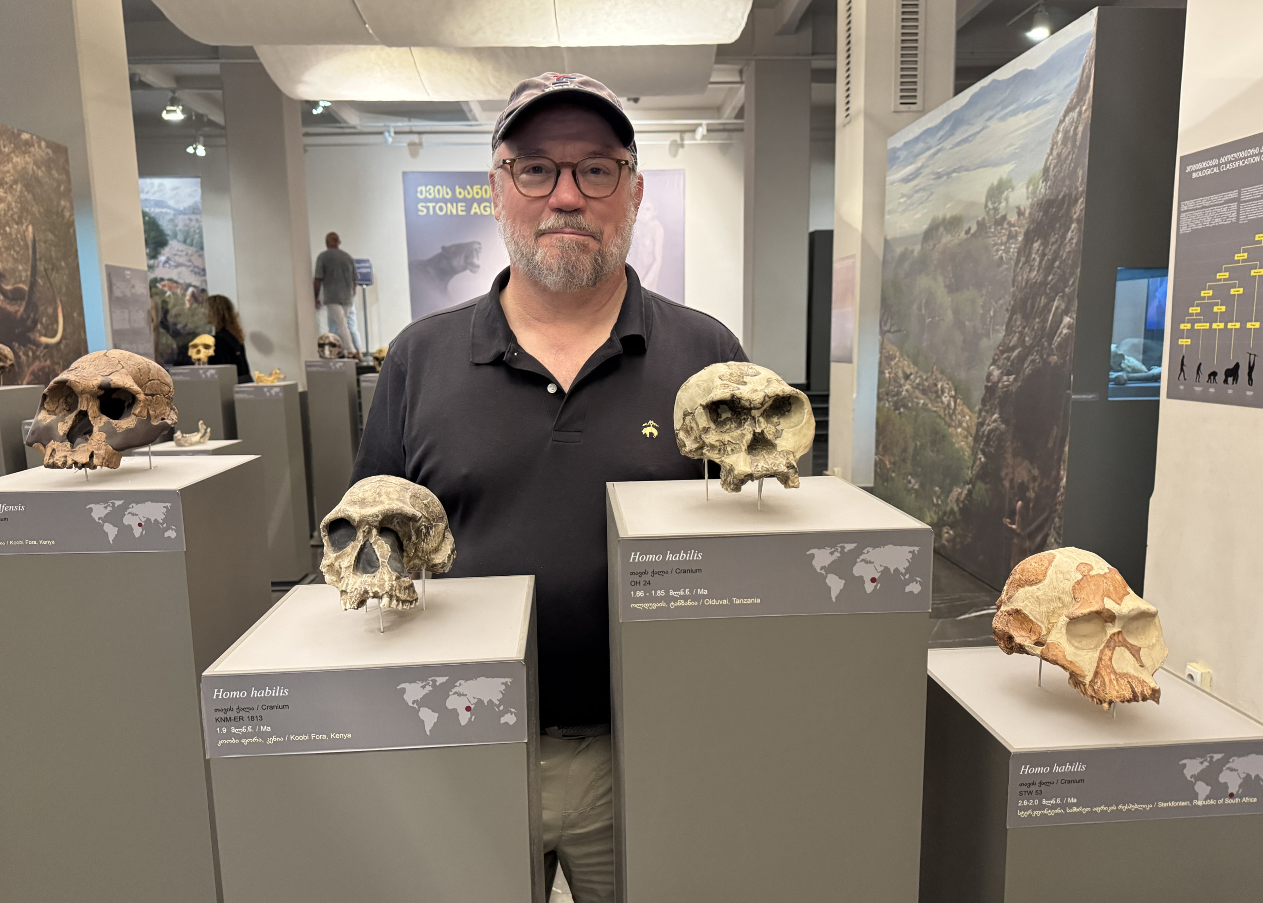 T.G. Schurr standing among casts of Homo erectus georgicus at the Georgia National Museum in Tbilisi.